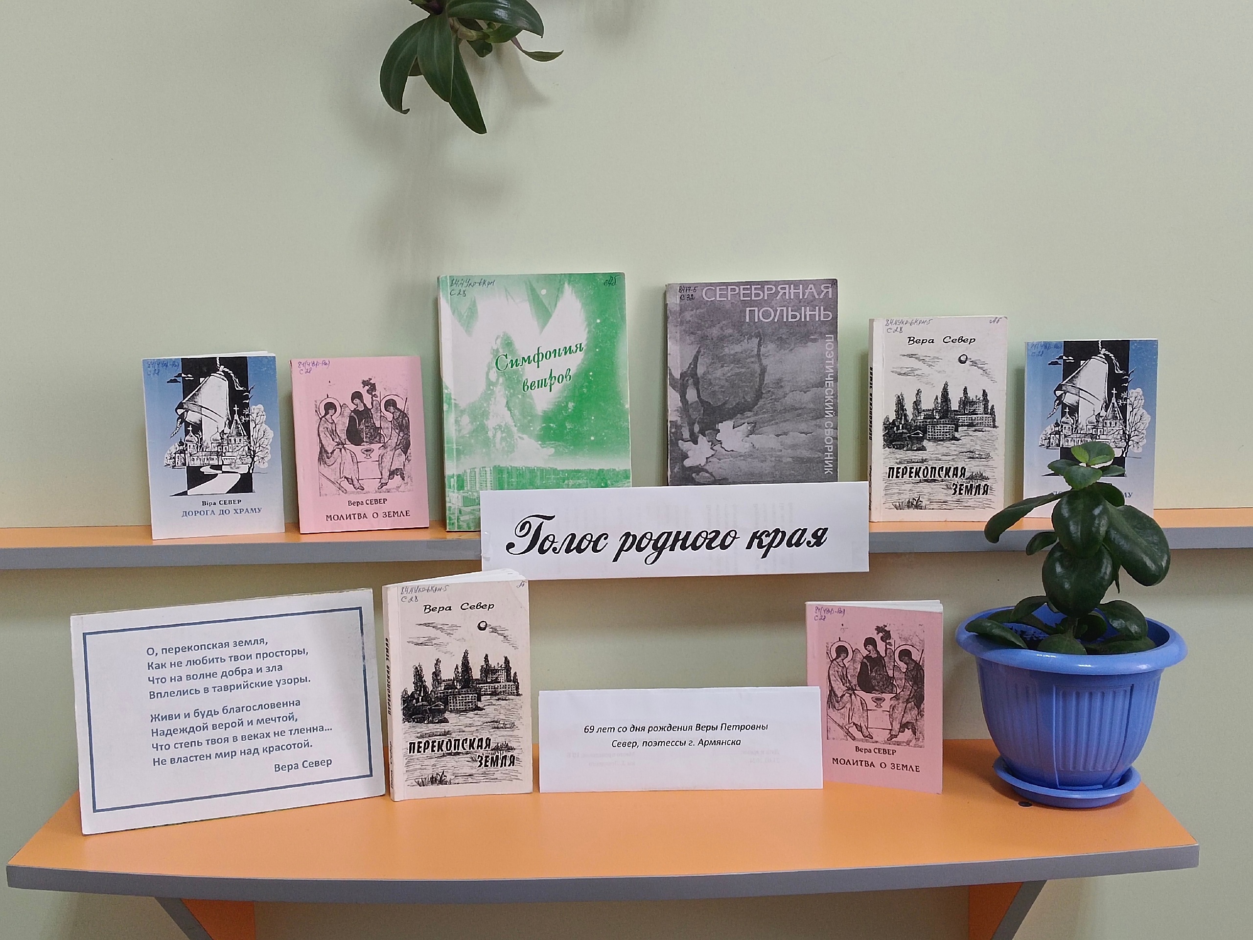 К этой дате на абонементе Центральной городской библиотеки им. З. Левицкого оформлена книжная полка "Голос родного края", на которой вы найдете сборники "Дорога до Храму" и "Молитва о земле", книгу стихов "Перекопская земля", а также сборники стихов армянских поэтов "Серебряная полынь" и "Симфония ветров". Уверенный, узнаваемый почерк мастера, умение увидеть прекрасное в окружающем мире, богатство образов и эпитетов, безусловная любовь к слову, родине, людям — вот что отличает поэзию Веры Север.